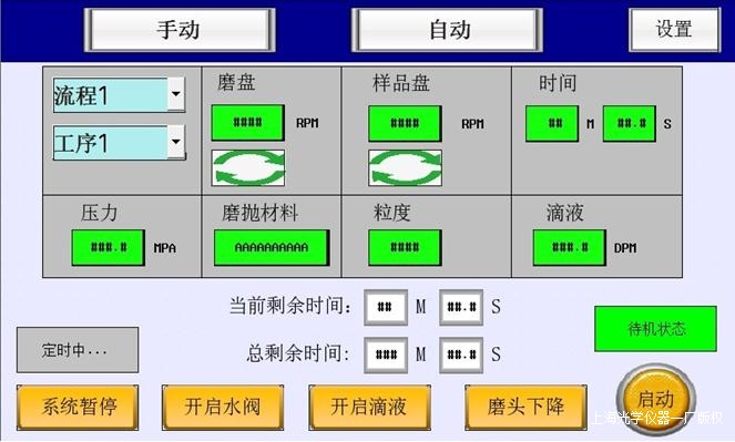 2) 單工序模式:根據(jù)每一步磨拋工序,可設(shè)置和調(diào)用30種工序參數(shù):磨盤和磨頭轉(zhuǎn)動(dòng)速度、磨拋時(shí)間、水通斷……